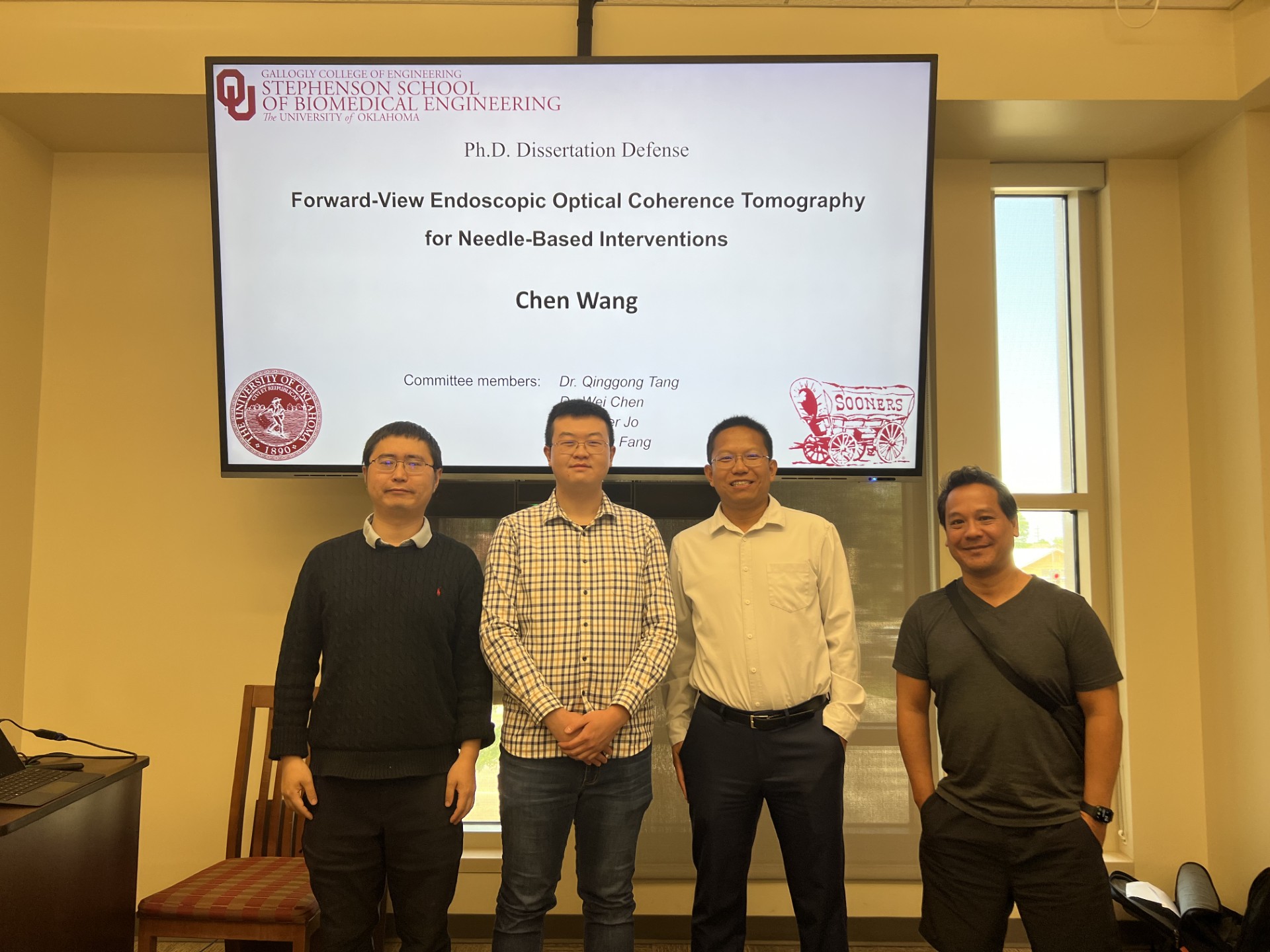 04/24--Chen successfully defended his Ph.D. thesis today. Congratulations, Dr. Wang! Thank you to the Ph.D. committee members, Drs. Wei Chen, Song Fang, and Javier A. Jo, and all the lab members!