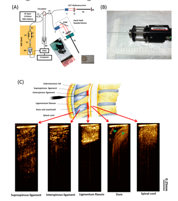We developed a small hand-held optical coherence tomography (OCT) forward-imaging needle device for real-time epidural anesthesia surgery guidance and demonstrated its feasibility through exvivo and in vivo animal experiments. With tissue structures visualized and differentiated at the needle tip, OCT needle imaging device will enhance clinical outcomes with regards to complication rates, induced pain, and procedure failure when compared to standard practice.