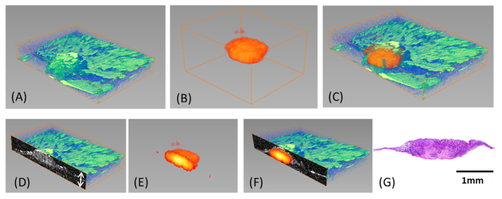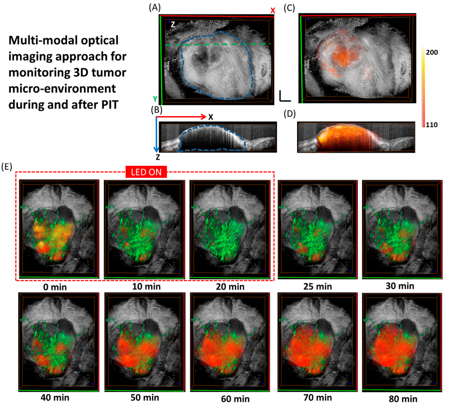 We applied a multi-modal optical imaging approach including high-resolution optical coherence tomography (OCT) and high-sensitivity fluorescence laminar optical tomography (FLOT), to provide 3D tumor micro-structure and micro-distribution of mAb-IR700 in the tumor simultaneously during photo-immunotherapy (PIT) in situ and in vivo.