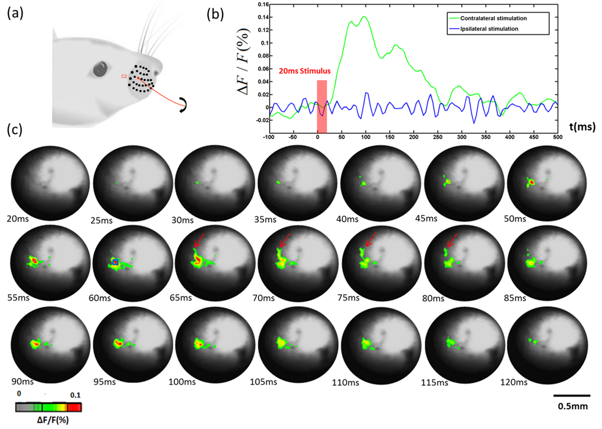 To access subcortical structures and image sensory-evoked neural activity, we designed a needle-based optical system using gradient-index (GRIN) rod lens. We performed voltage-sensitive dye imaging (VSDi) with GRIN rod lens to visualize neural activity evoked in the thalamic barreloids by deflection of whiskers in vivo.